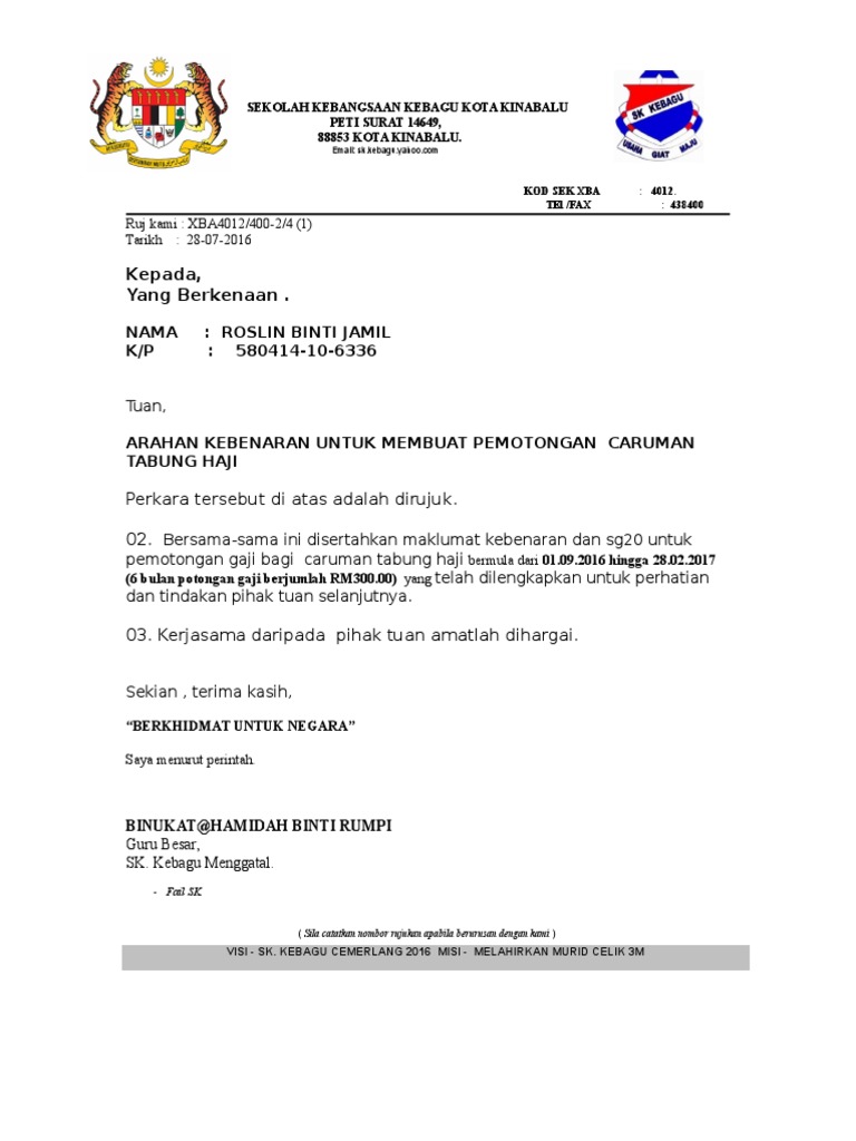 Pemotongan gaji untuk pembayaran angsuran pembiayaan. Kumpulan contoh surat pemotongan gaji tabung haji dan contoh surat pemotongan gaji tabung haji yang bisa anda download secara gratis disini. Jp006_borang akaun waris pengeluaran pusaka. By posted on february 1, 2020. Tabung haji will provide employer code via email and employer/administrator will. Simpanan melaiui caruman potongan gaji ke akaun tabung haji ( th) adalah salah satu perkhidmatan yang disediakan :